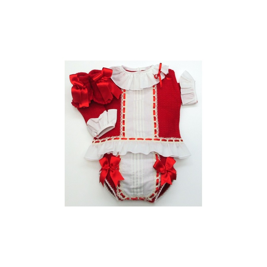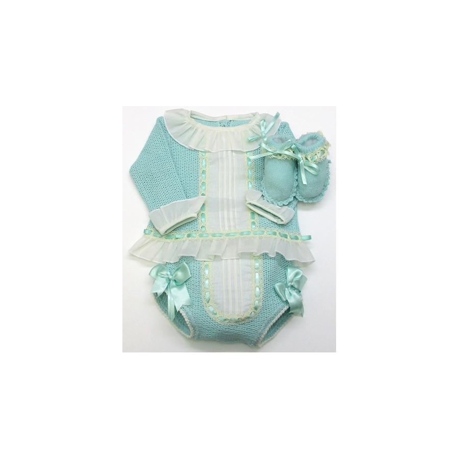 Conjunto de primera puesta, formado por jersey, braga y patucos, en colores pastel, con lazos a tono y con volantes de batista y encajes, en color crudo.