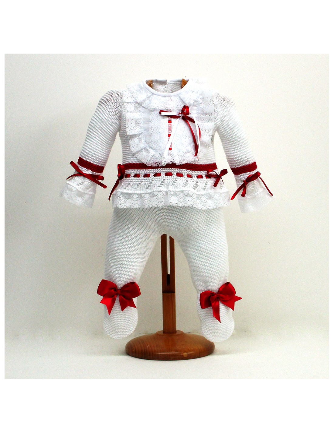 Conjunto de jersey y polaina, en color blanco y con decoraciones y lazos en color a elegir.