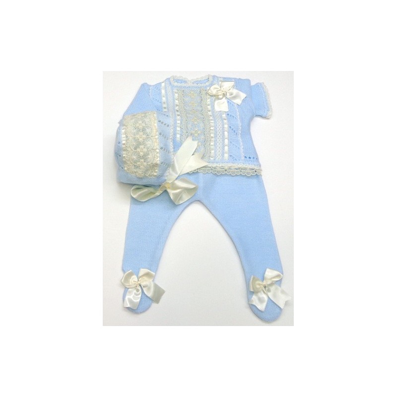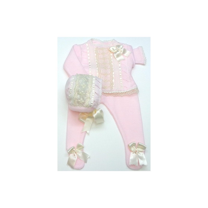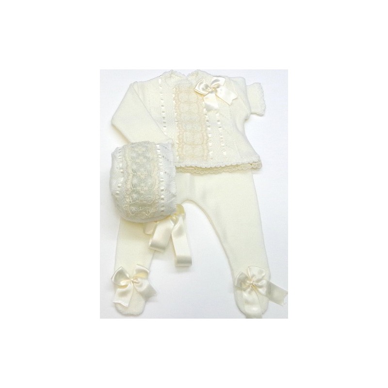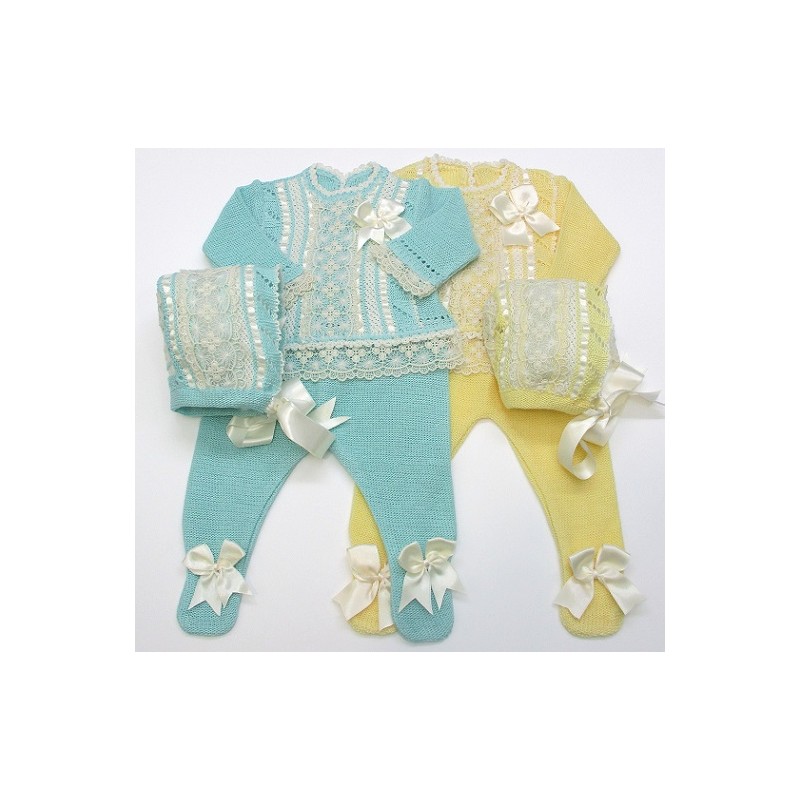 Jersey, polainas y capota, con encajes de guipure y lazos en crudo, el tejido de punto en color al elegir.