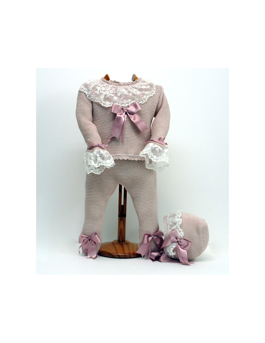 Jersey, polainas y capota, de punto, en color pastel a elegir, pajaritas del mismo tono, con encajes de tul bordado en color crudo. Guia de tallas: T.1M para 4 kg// T.3M para 5,5kg// T.6M para 7 kg// T.9M para 8 kg// T.12M para 9,5kg// T.18M para 11 kg// T.24M para 12,5kg//