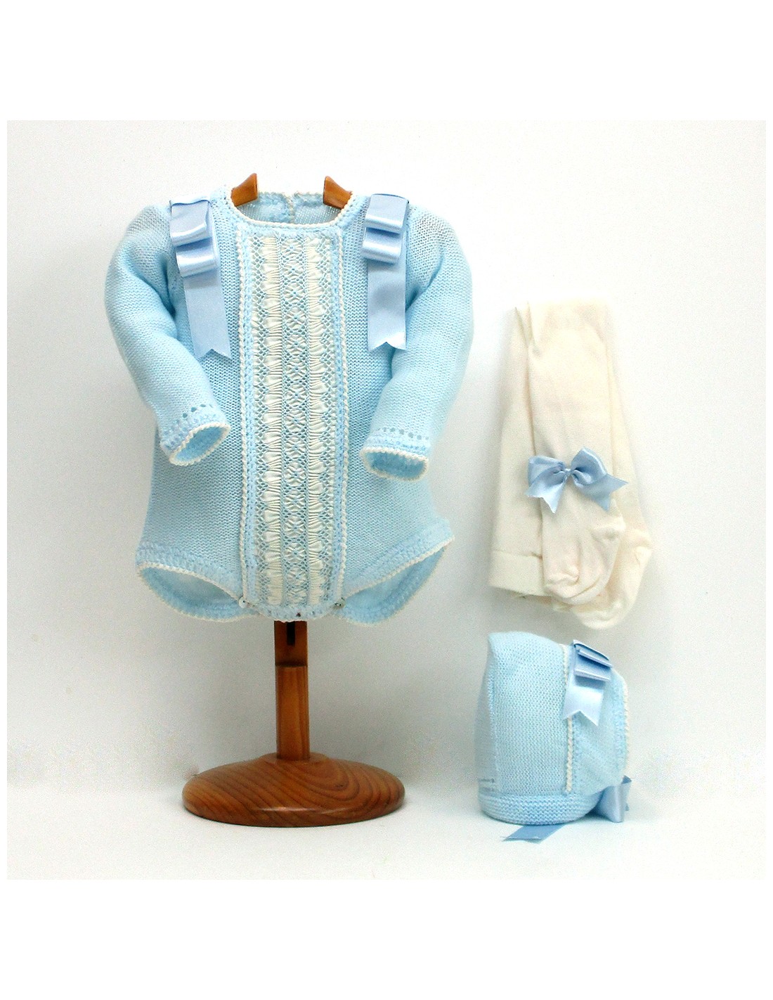Conjunto de pelele con bordados de punto ruso, leotardos y capota, en colores rosa o celeste a elegir.