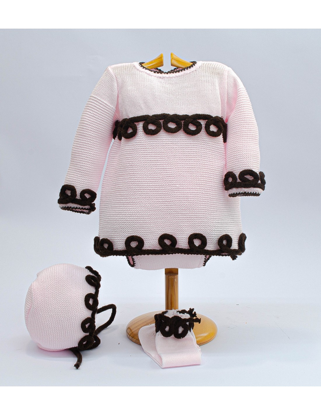 Conjunto de vestido, braga, calcetín y capota, el tejido de lana en color rosa bebé y con decoraciones de cordón formando caracolillo en color marrón. Tallas desde 1 mes hasta 24 meses. Guia de tallas: T.1M para 4 kg// T.3M para 5,5kg// T.6M para 7 kg// T.9M para 8 kg// T.12M para 9,5kg// T.18M para 11 kg// T.24M para 12,5kg//