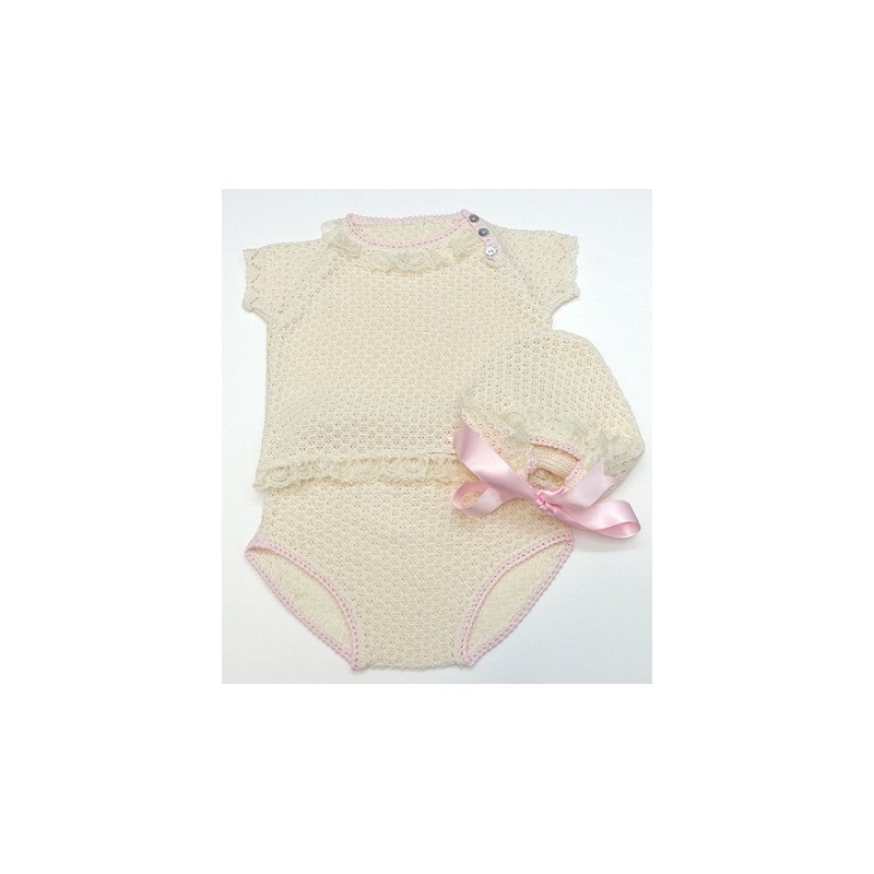 Jersey de manga corta+braga, tejido nido de abeja, disponible en varios colores, con encaje de puntilla en color crudo, con capota a juego.