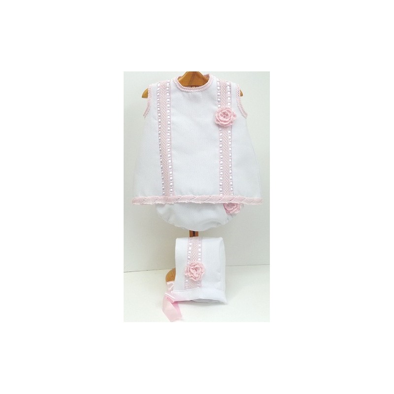 Jesusito colección Abril, confeccionado en piqué y pasacintas de punto. Acabados r de ganchillo artesanal. Disponible en varias tonalidades y tallas + Capota a juego.