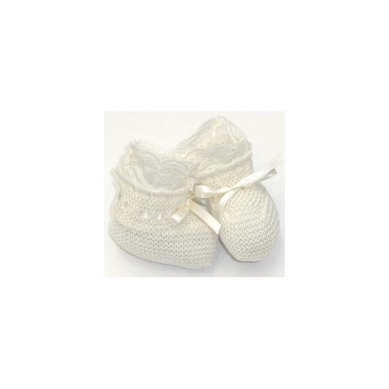 Patucos de punto bobo en colores pastel, terminados con lazo y puntilla de nylón en colores crudo o blanco.