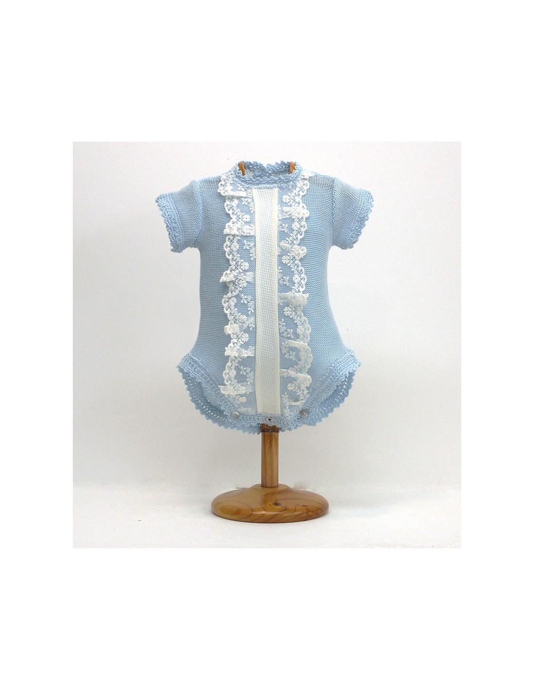 Pelele en colores pastel y con decoraciones frontales de pique y encajes de tul bordado en color blanco.