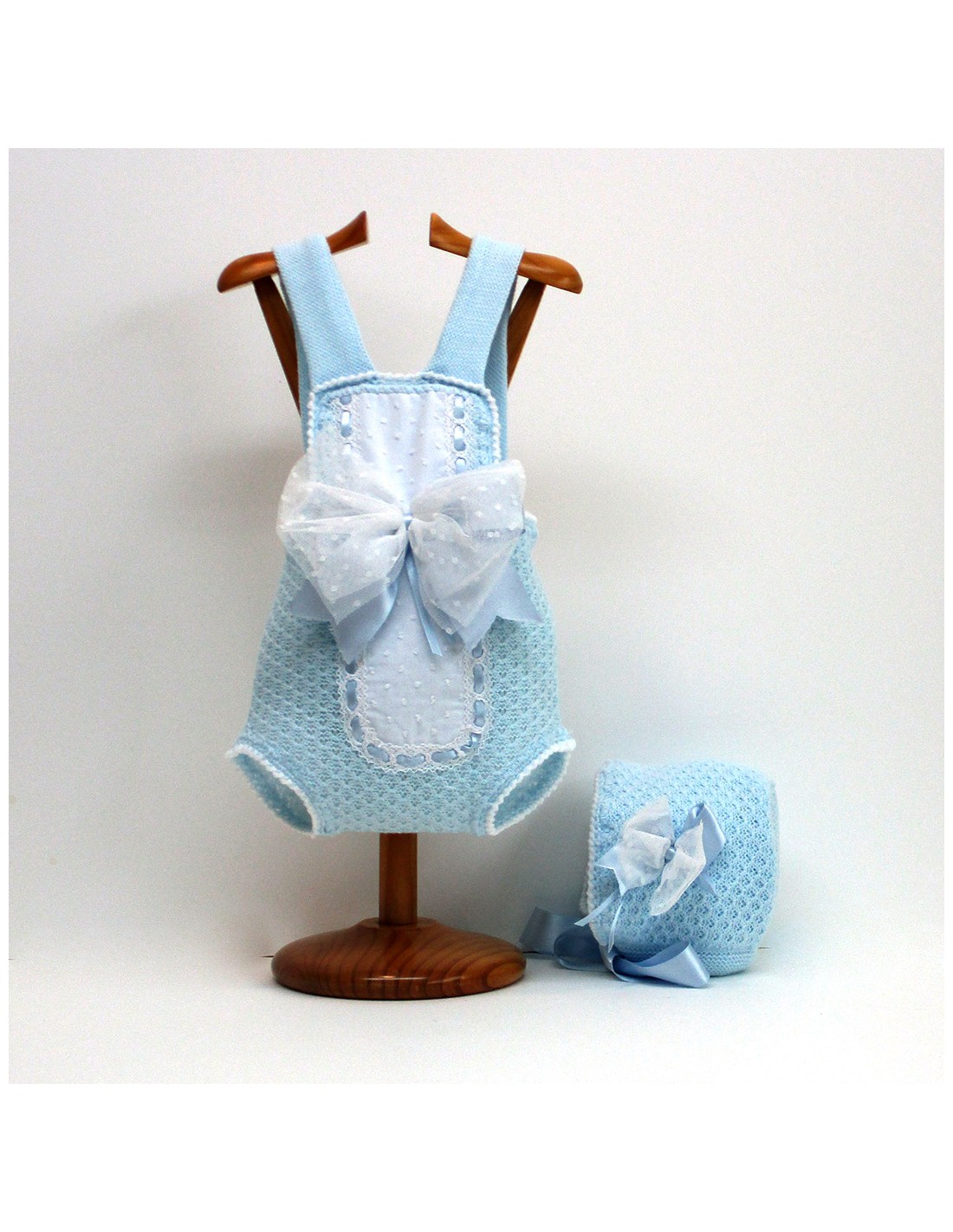 Conjunto de peto y capota, en colores pastel y con telas y encajes en color blanco.