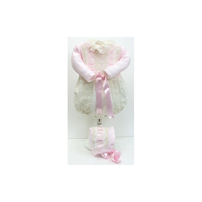 Pelele combinado, con encajes de guipure, la parte inferior de piqué y encajes en crudo, el tejido de punto y lazos en color al elegir. Blusa y capota a juego.