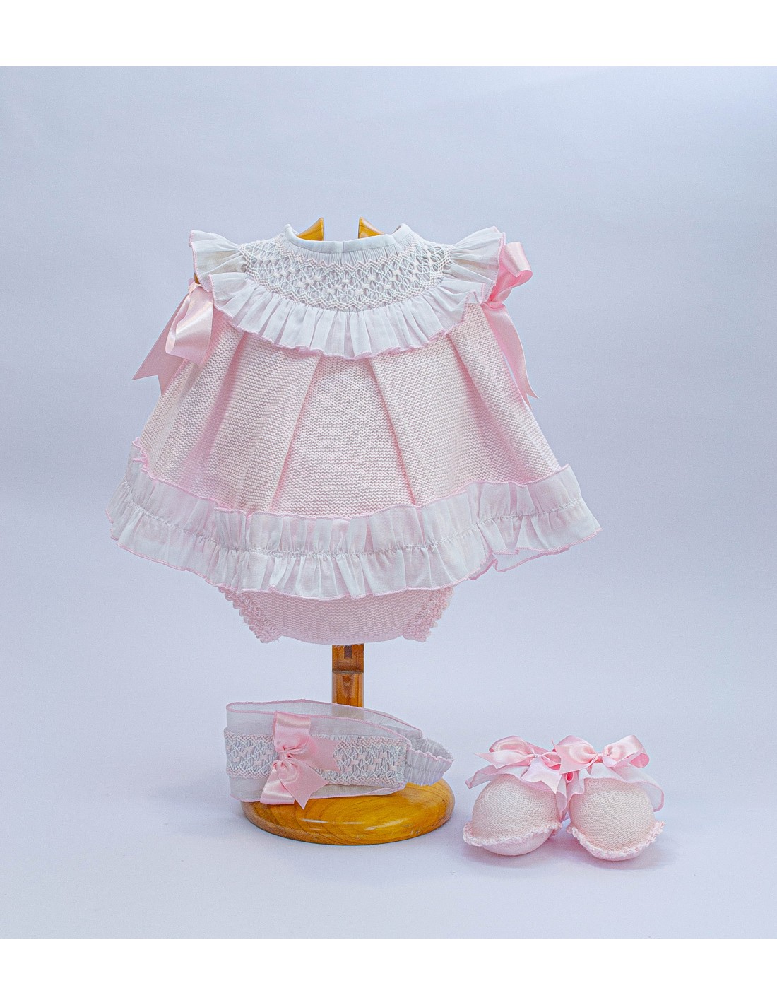 Conjunto de jesusito con cuello de punto ruso, diadema y patucos, en colores pastel y con telas en blanco, Tallas: T.0M para 3.5 kg o T.1M para 4 kg.