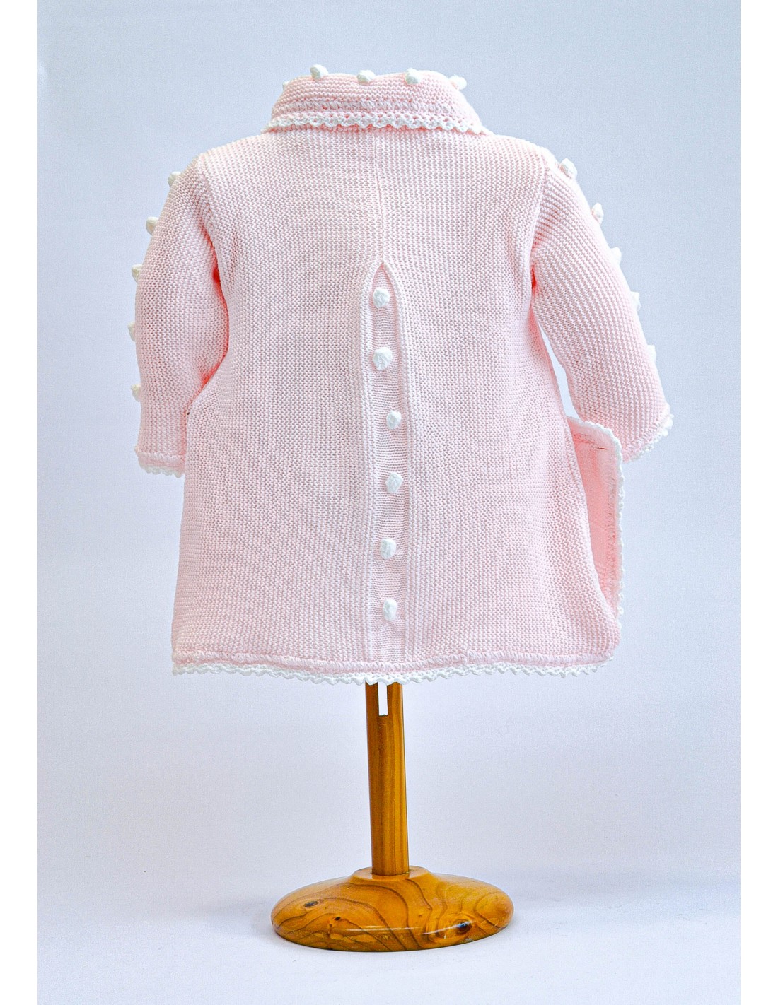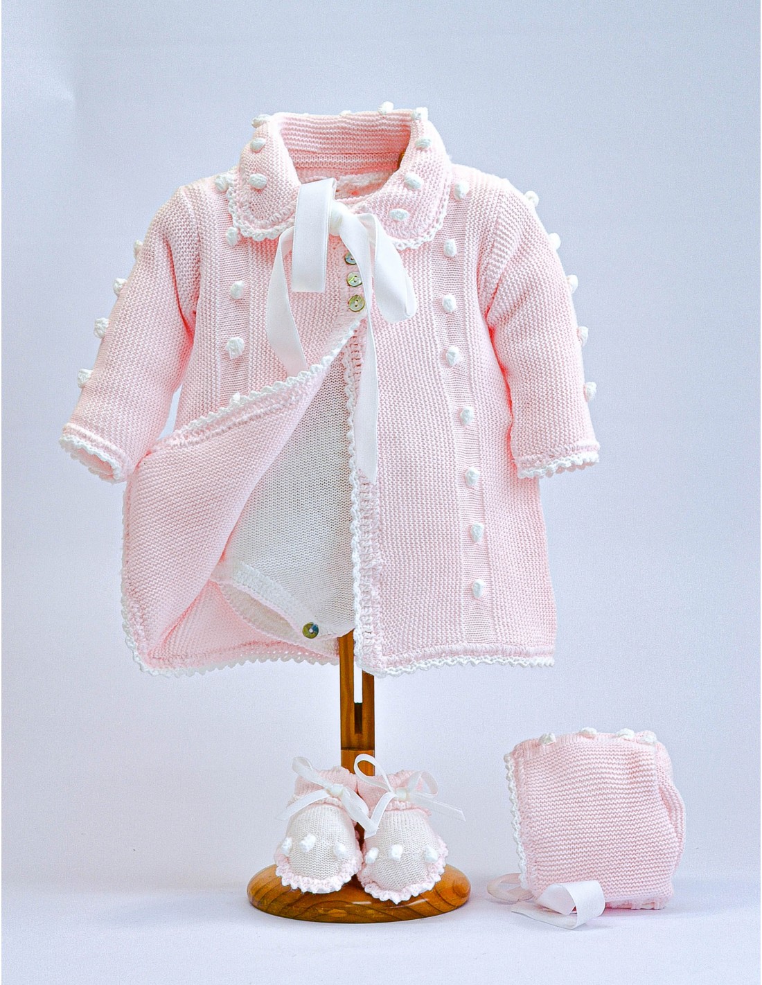 Conjunto de abrigo, pelele, patucos y capota, en color BLANCO, con bordados a mano, en rosa (foto), celeste o camel.