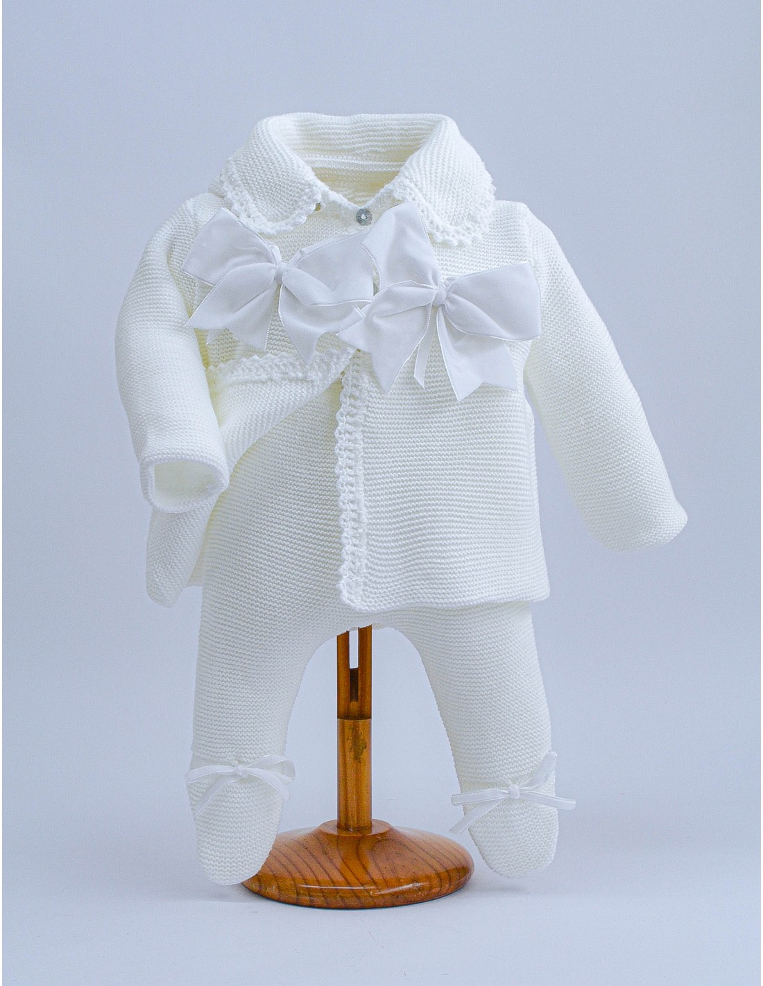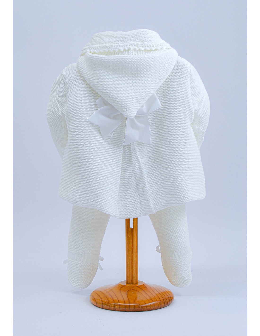 Conjunto de pelele de manga larga con chaquetón de doble capa y con capucha, lazos de tul en blanco roto, colores del tejido: blanco, celeste o en rosa