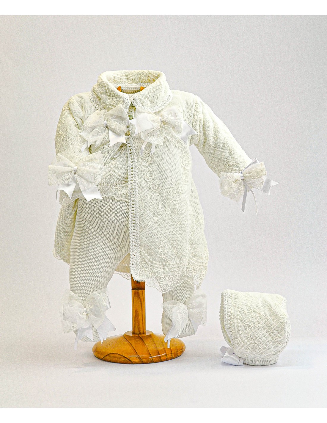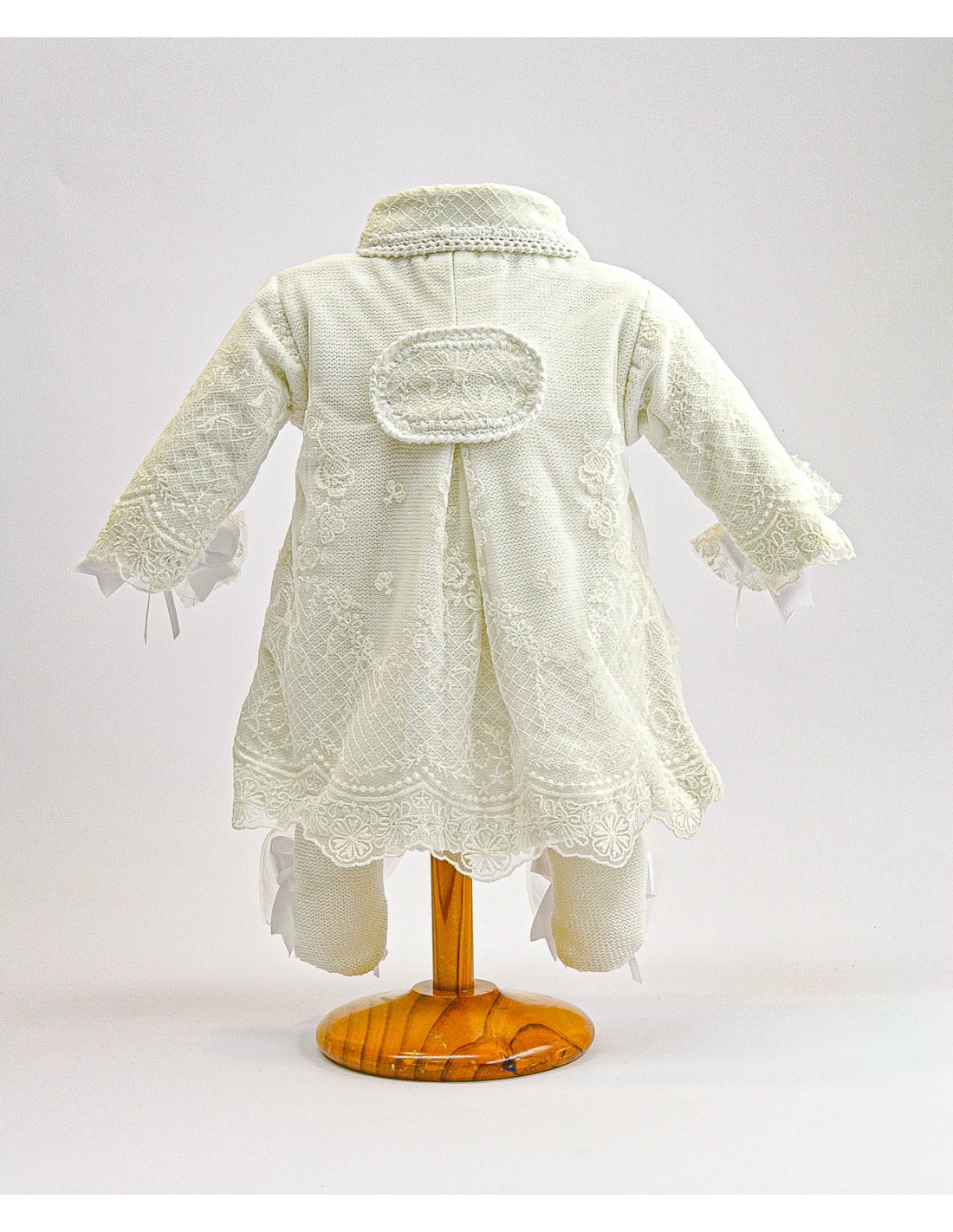 Abrigo de doble capa, lazos de tul en blanco roto, con jersey, polaina y capota, colores del tejido: blanco, celeste o en rosa