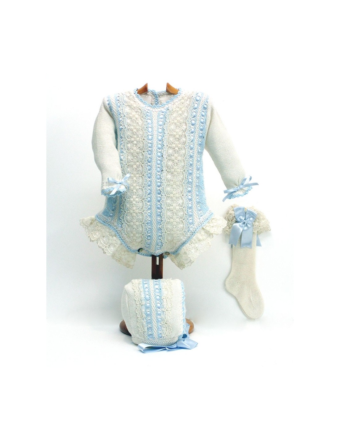 Pelele de punto de manga larga, con encajes de guipur, color crudo, con lazos de pasamanería y pajaritas en colores pastel a elegir, capota y calcetín a juego.