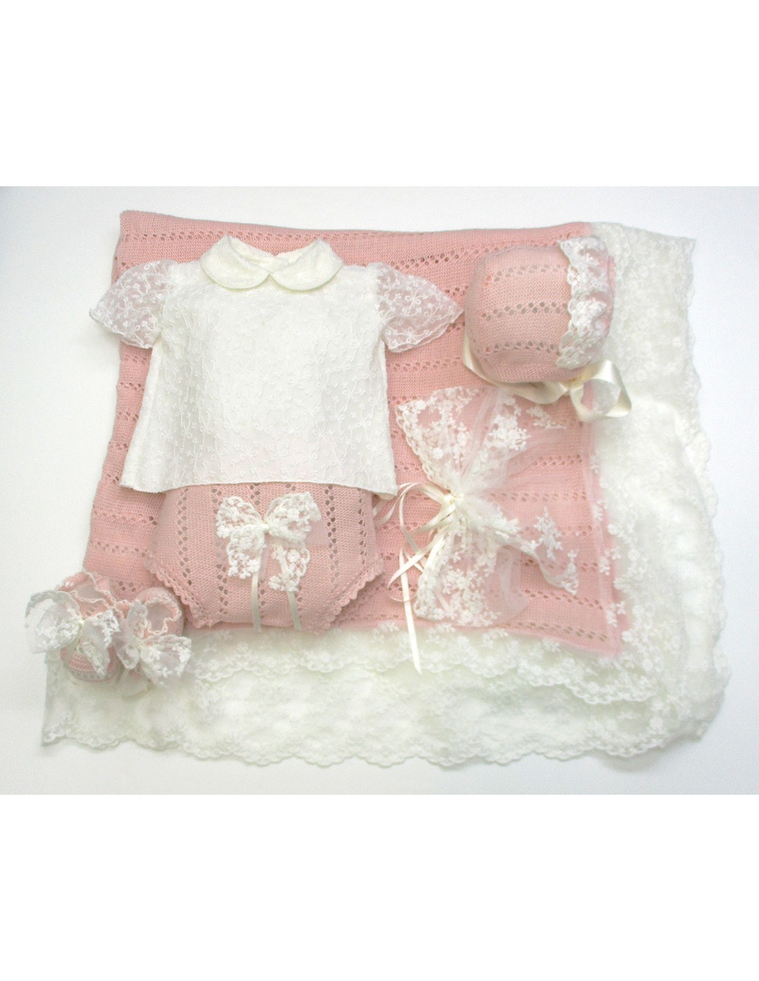Conjunto de primera puesta, formado por camisa, braga, capota, patucos y toquilla, el tejido de de punto en colores pastel a elegir, telas y encajes de tul bordado en color crudo.