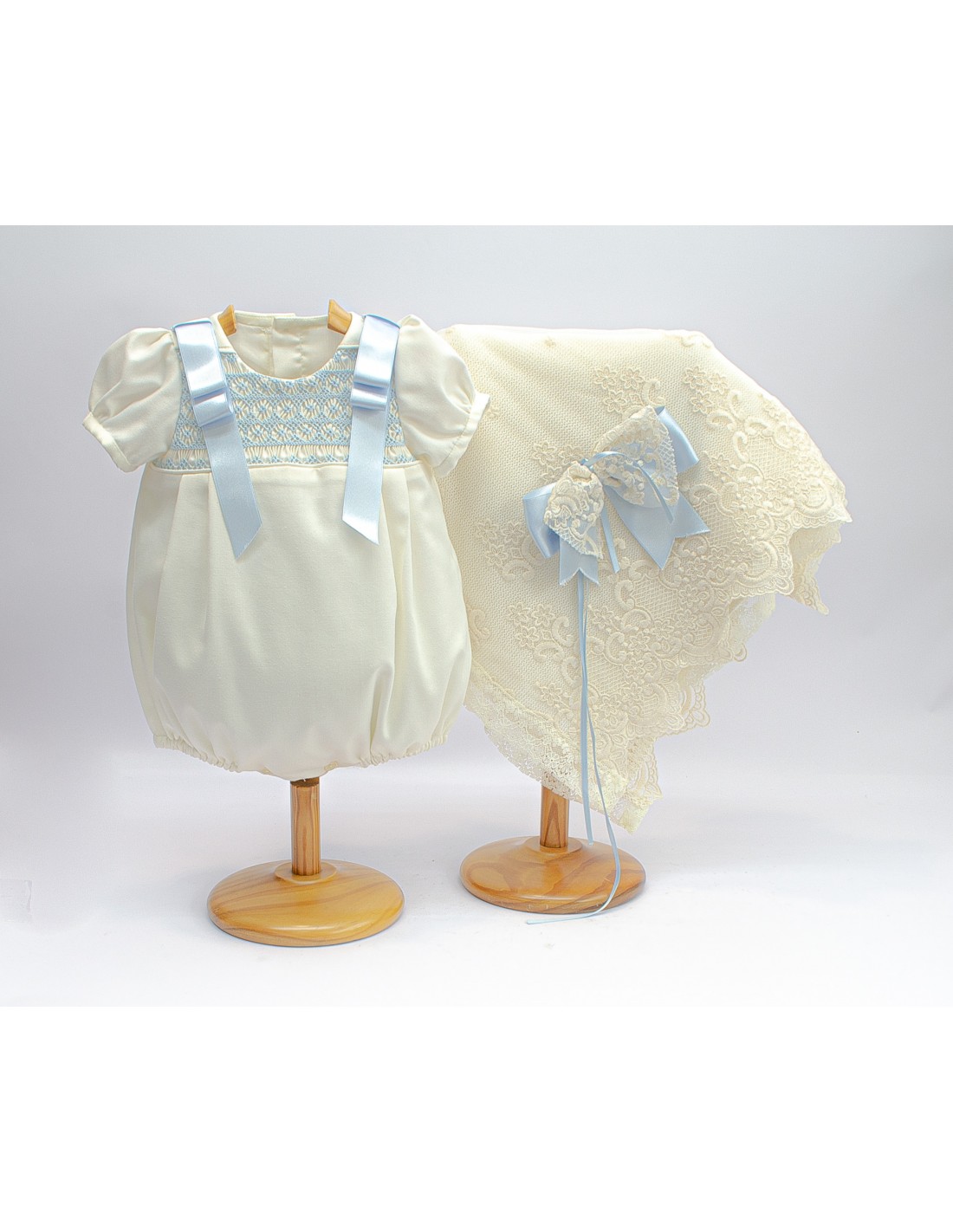 Conjunto de primera puesta formado por pelele de punto ruso y toquilla con encajes de tul bordado, en colores crudo con bordados y lazos en rosa o celeste.
