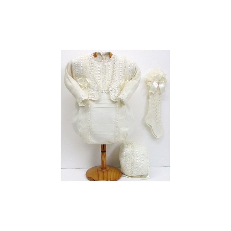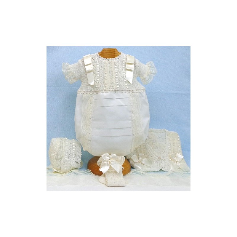 Pelele de ceremonia en colores blanco o crudo. La parte superior de tejido de punto con lazos de pasamanería, la inferior de batista. Chaqueta, capota y calcetin a juego.