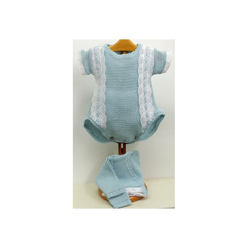 Pelele de punto, manga corta, varios colores y tallas, con encajes en blanco o crudo, con chaqueta a juego.