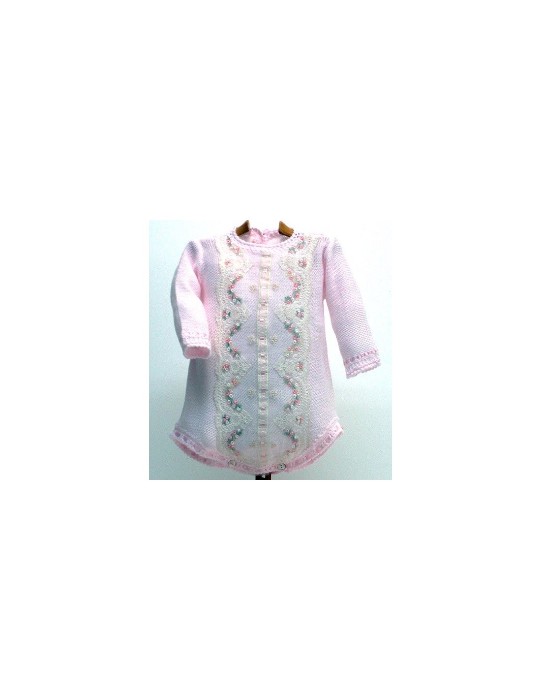 Pelele de punto de manga larga con encajes de tul bordado, el tejido de punto en crudo, rosa o celeste, con decoraciones de tul bordado a juego.