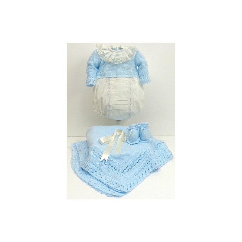 Pelele combinado, la parte superior de tejido de punto y en colores pastel, con cuello de volante y la parte inferior de batista en crudo, con manta y patucos a juego.