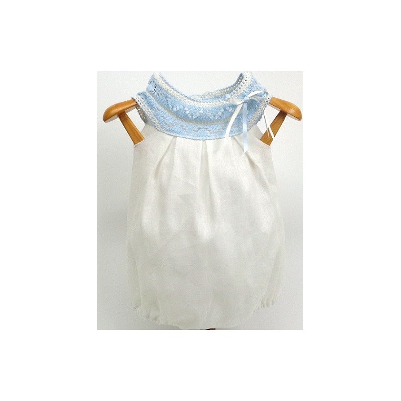 Pelele sin manga, de cuello de punto y la parte inferior de lino en crudo o blanco.