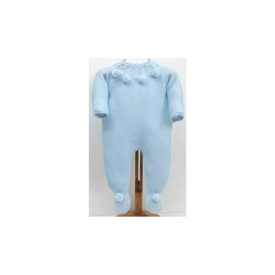 Pelele de punto, lleva tejido liso y en pechera de ochos y pompones, así como en pies.