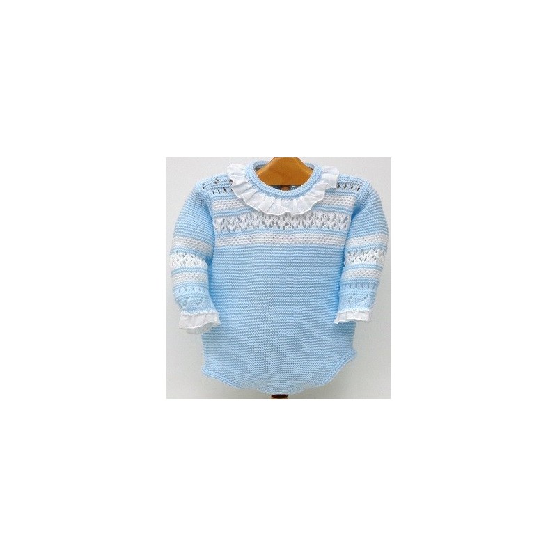 Pelele braga terminado en cuello y mangas con tirabordada en blanco o crudo y como segundo color al combinar