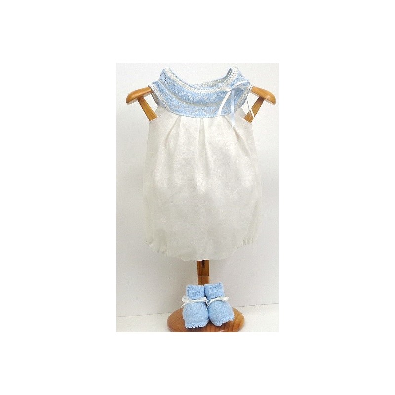 Conjunto de primera postura formado por pelele sin manga, de cuello de punto y la parte inferior de lino en crudo o blanco con patucos.