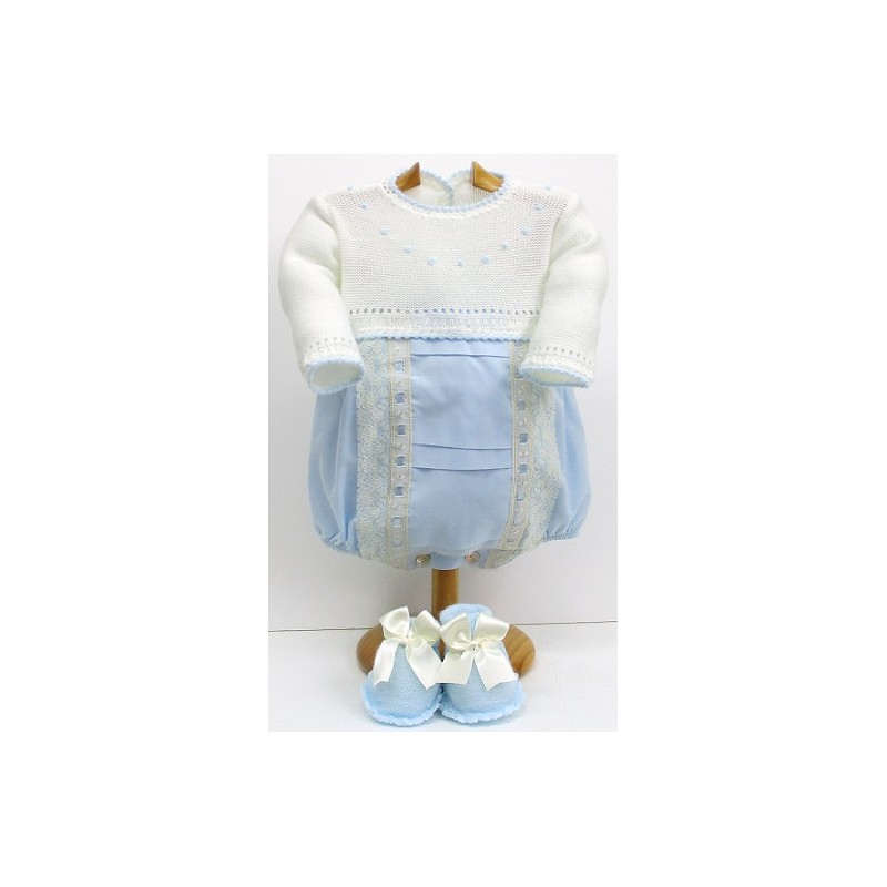 Pelele combinado, de cuerpo de punto con bordados de rococó y la parte inferior de plumeti, con patucos a juego. Para la elección de combinaciones de colores el segundo es el del plumeti y lazos.
