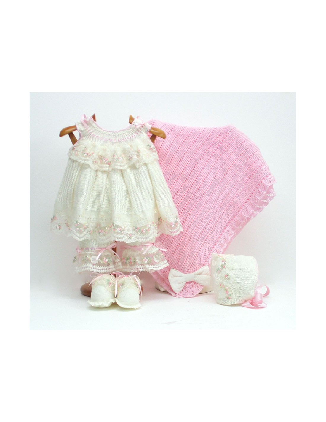Conjunto de vestido de cuello redondo de tirantes, pololo, capota, patucos y toquilla personalizada, en colores crudo, rosa o celeste, con encajes de tul bordado y toquilla en rosa o celeste.