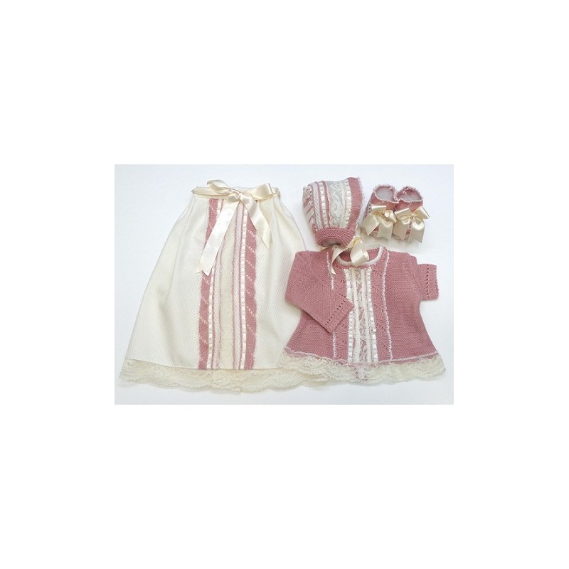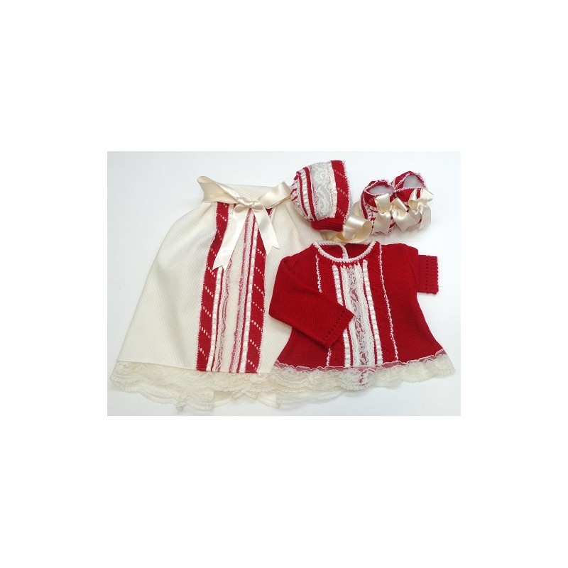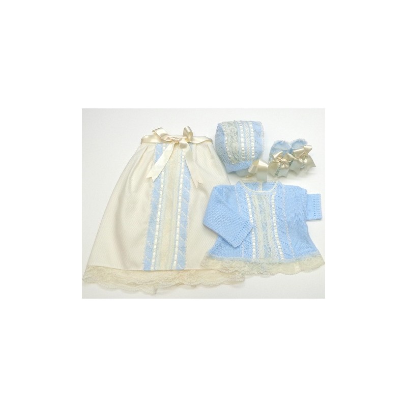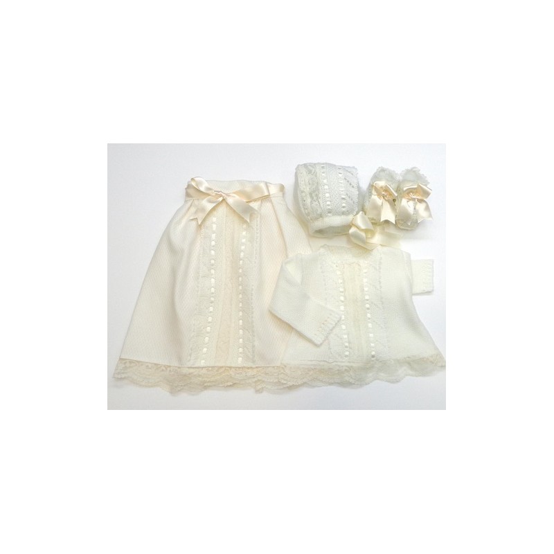 Conjunto de Primera puesta en lana, formado por faldón, jersey, patucos y capota, en varios tonos combinados con piqué y encajes en crudo o blanco. Varias tallas a elegir.