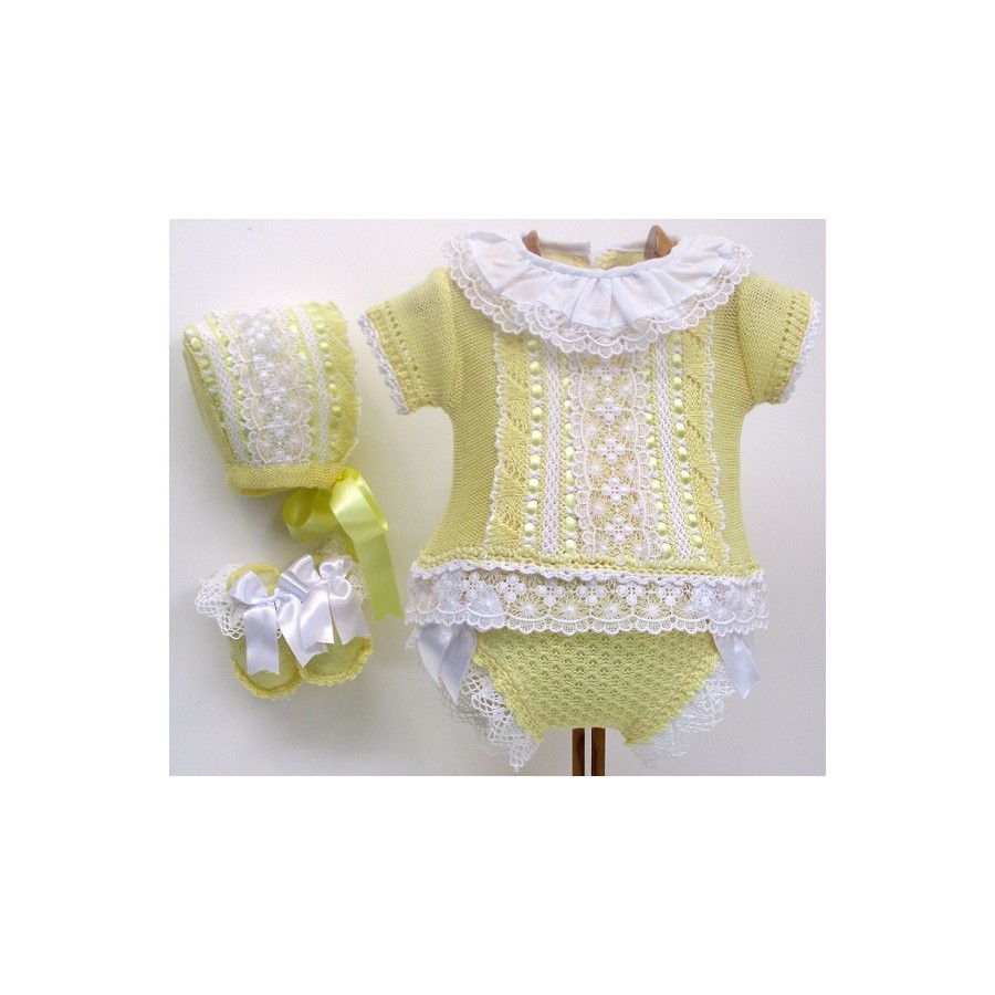 Conjunto de primera puesta, formado por jersey de manga corta, de punto liso y con lazos de pasamanería y encajes de guipur, con braga, capota y patucos de tejido nido y en varios colores pastel y encajes de puntilla de hilo y lazos en colores blanco o crudo.