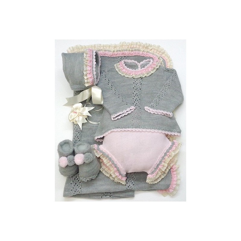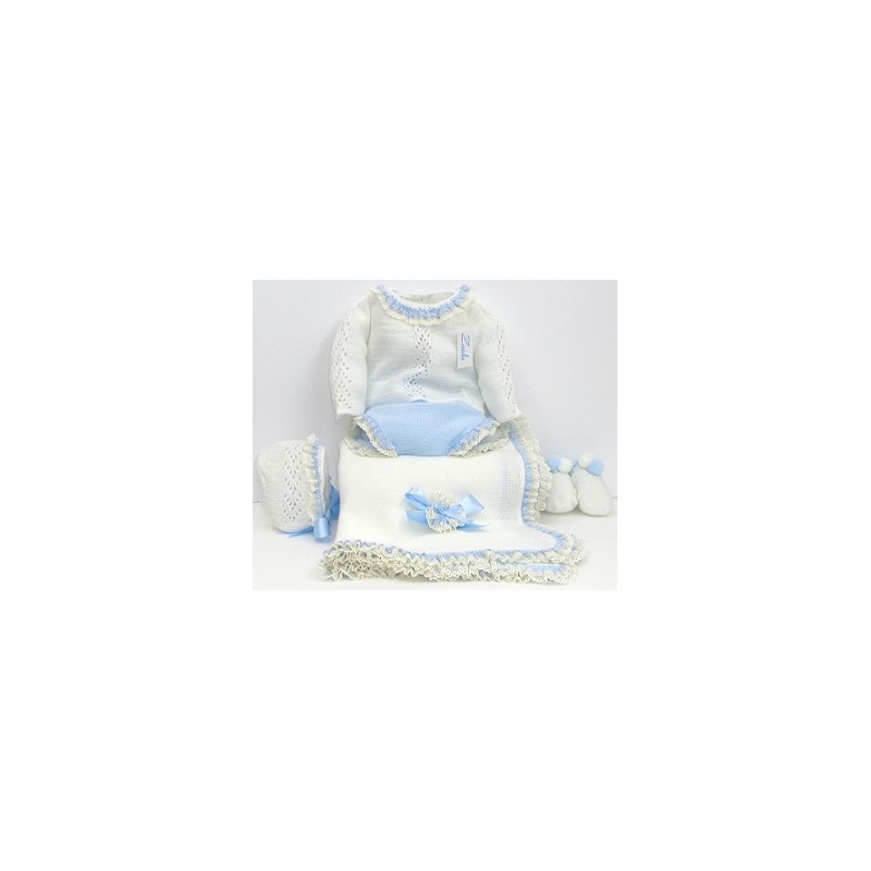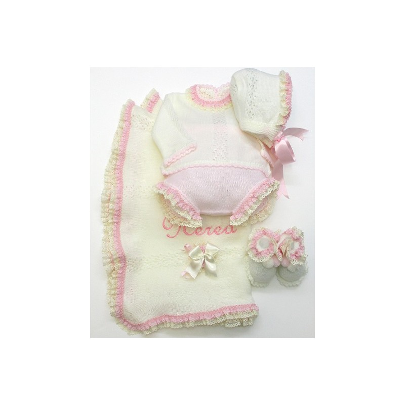 Conjunto formado por manta, jersey, braga, capota y patucos.