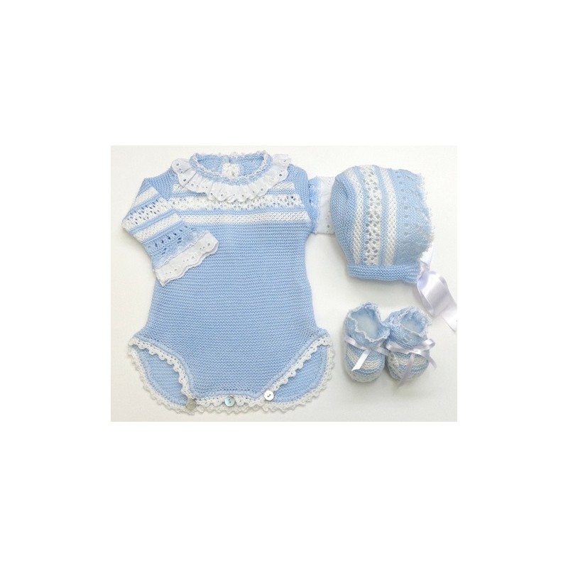 Conjunto de tres piezas formado por pelele de punto, capota y patucos.