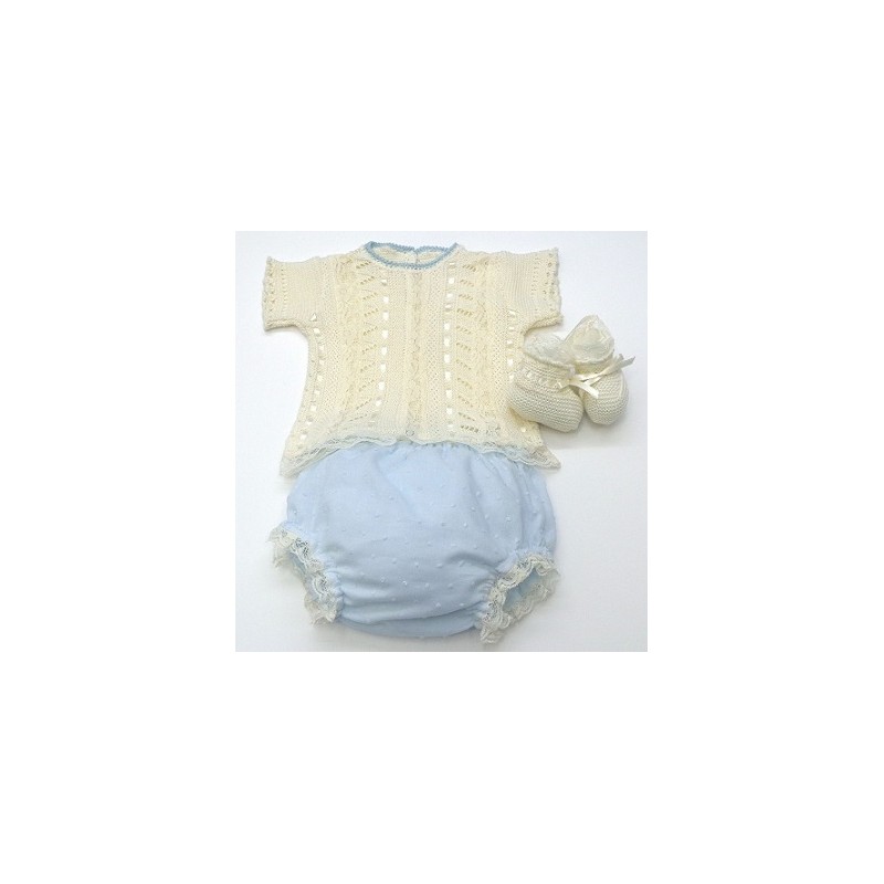 Jersey de manga corta en colores crudo o blanco, terminado con puntilla y lazos mismo color y ganchillo en el cuello del color de la braga+ braga de plumeti en colores blanco, rosa, crudo o celeste+ patucos a juego.