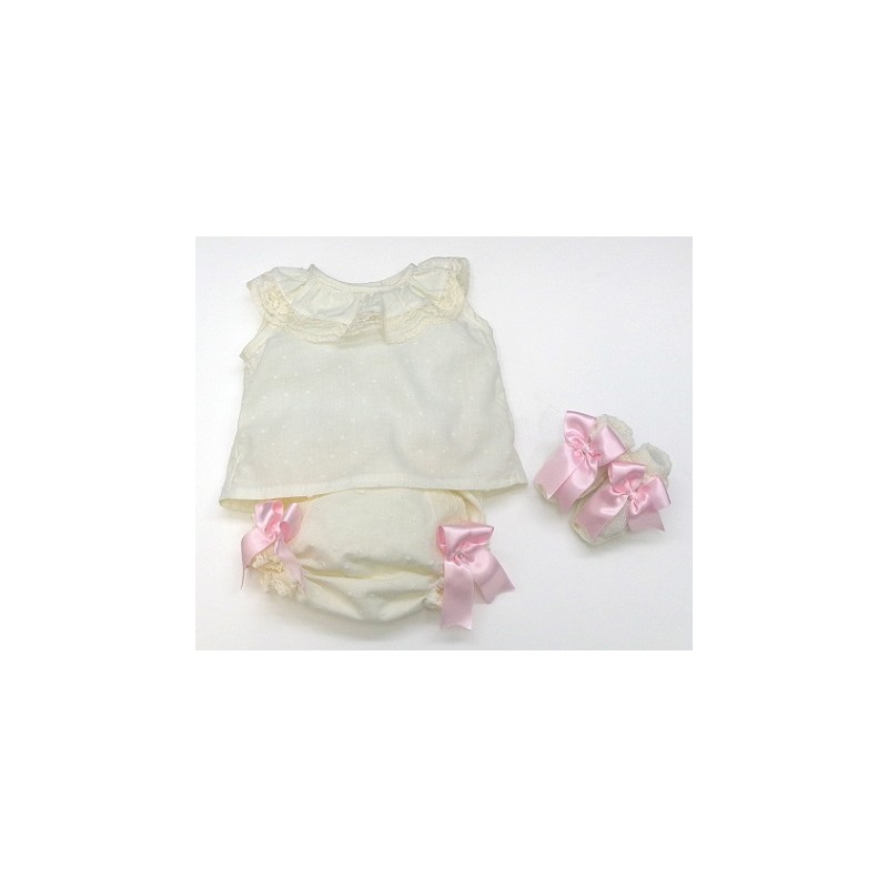 Conjunto de Primera puesta: Camisa sin manga y braga de plumeti con encajes, en colores blanco o crudo, con lazos en rosa, celeste o crudo+ Patucos a juego.