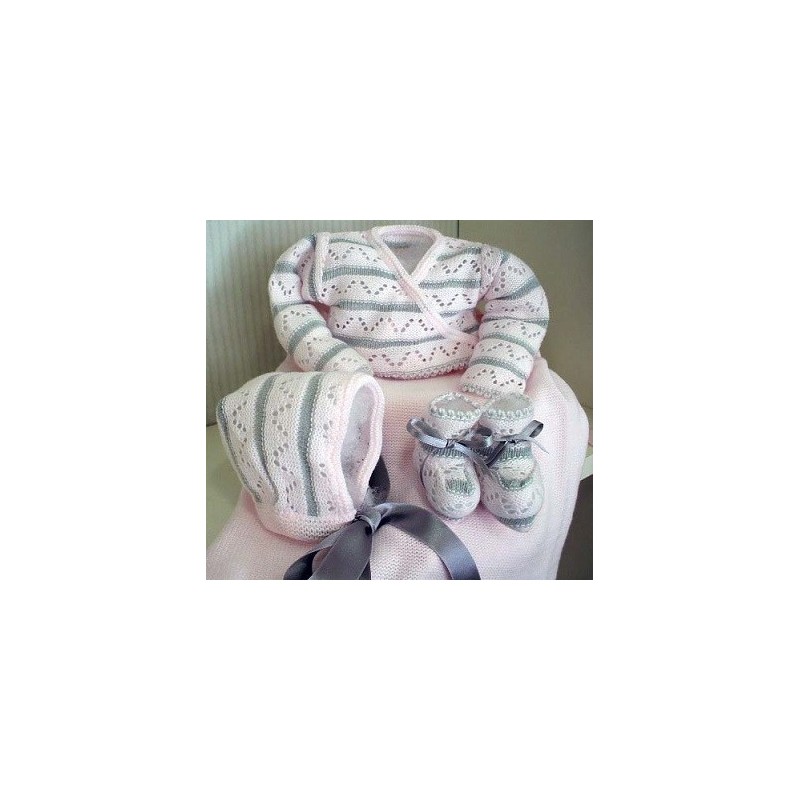 Conjunto formado por chaqueta de cruzar+faldón+capota+patucos a juego.