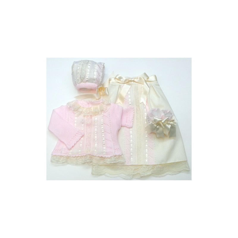Conjunto de primera puesta formado por faldón de piqué, jersey con encajes, capota y patucos, el tejido de punto en colores rosa o celeste, la tela, encajes y lazos en blanco o crudo.