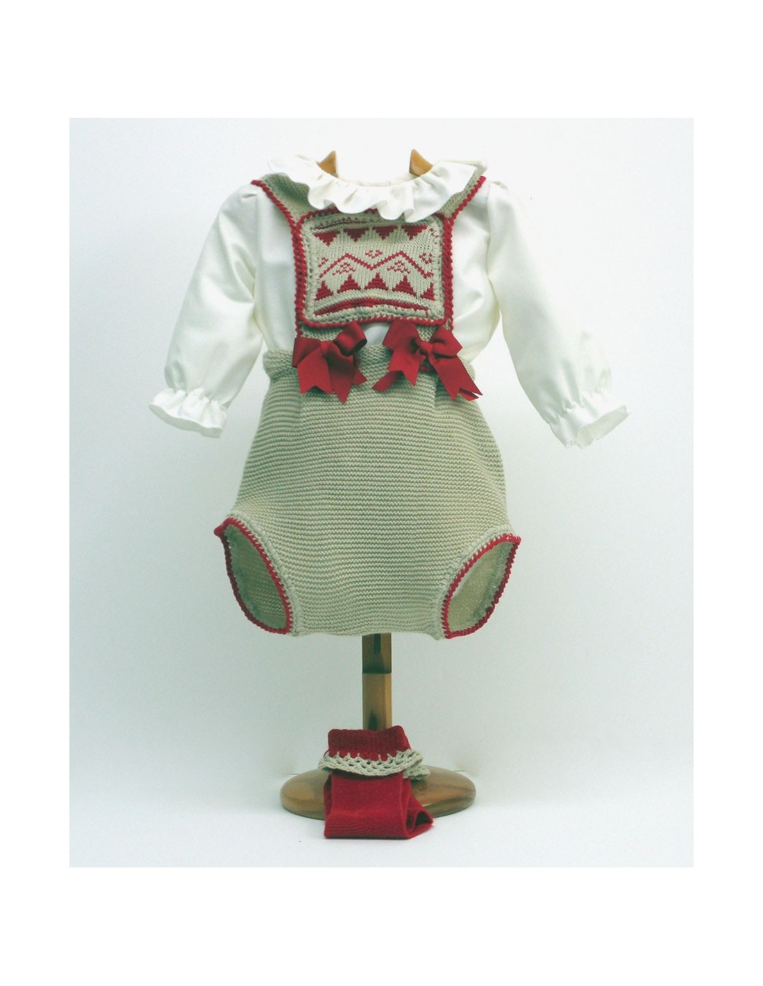 Conjunto de ranita, peto con cenefa y lazos , camisa de viyela y calcetin largo a juego, en color único camel/rojo. Si deseas otra combinación puedes contactarnos en el 984491254.