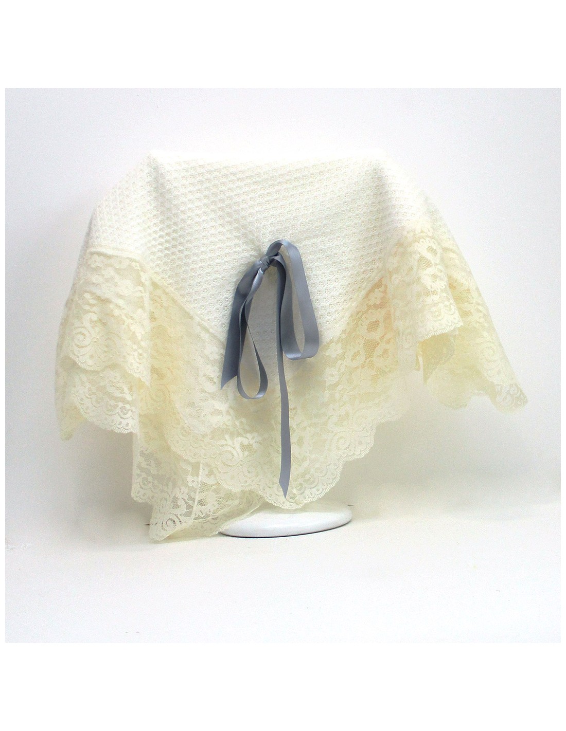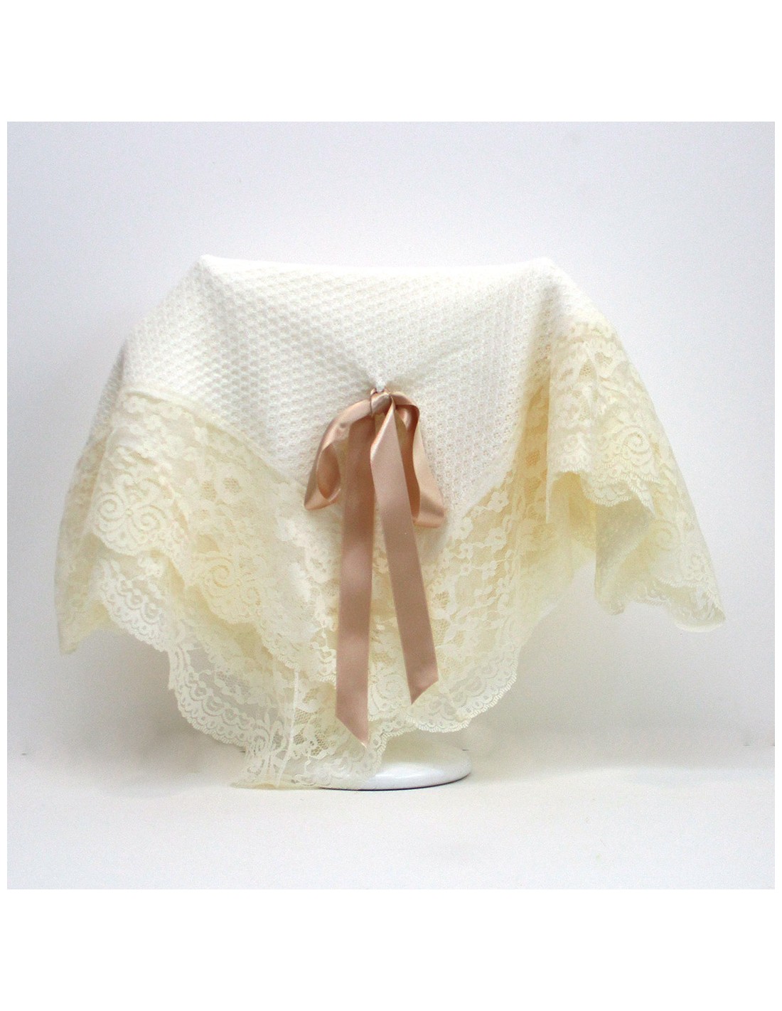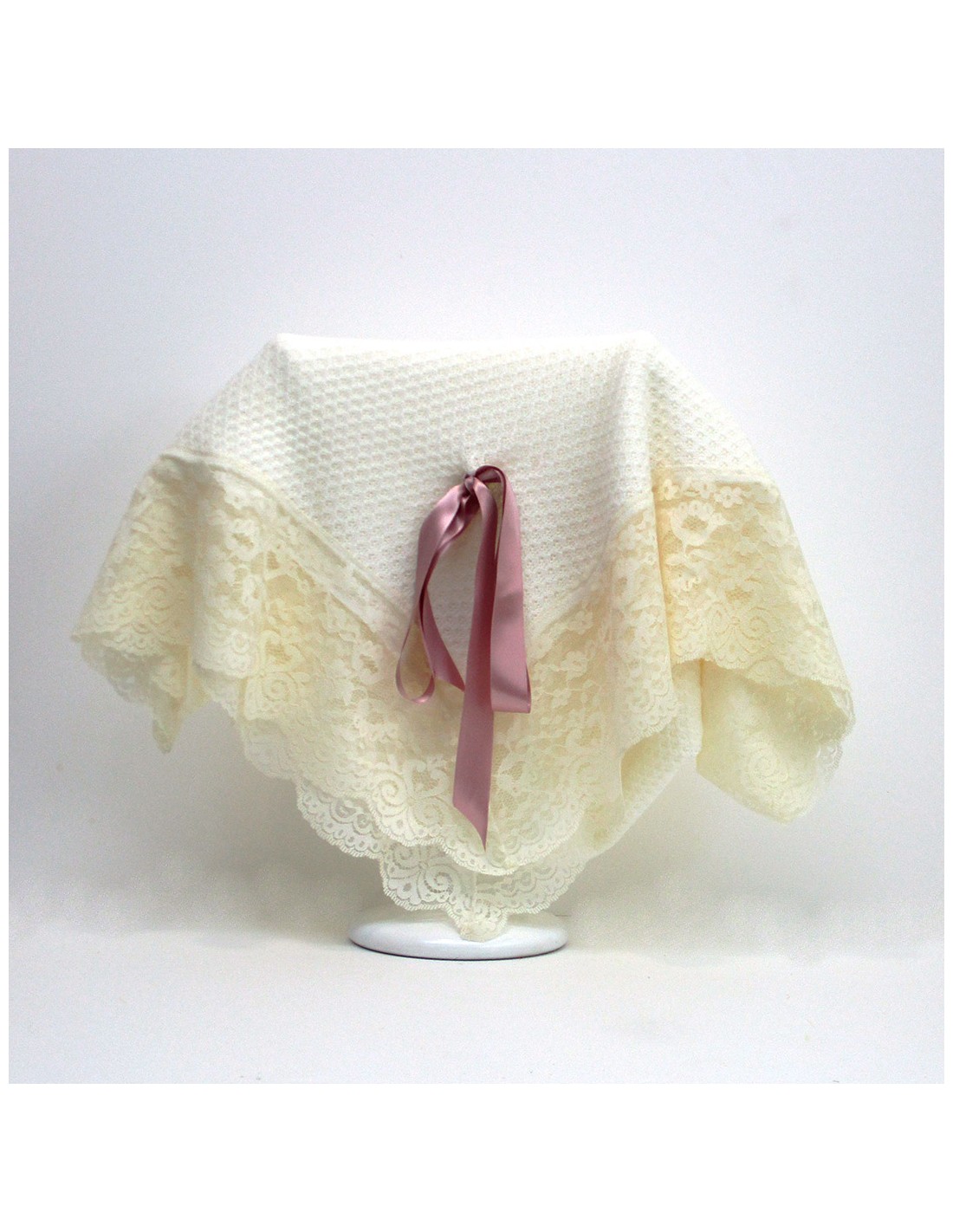 Toquilla de tejido nido, en color crudo y con encajes del mismo tono, con lazadas en color pastel a elegir.