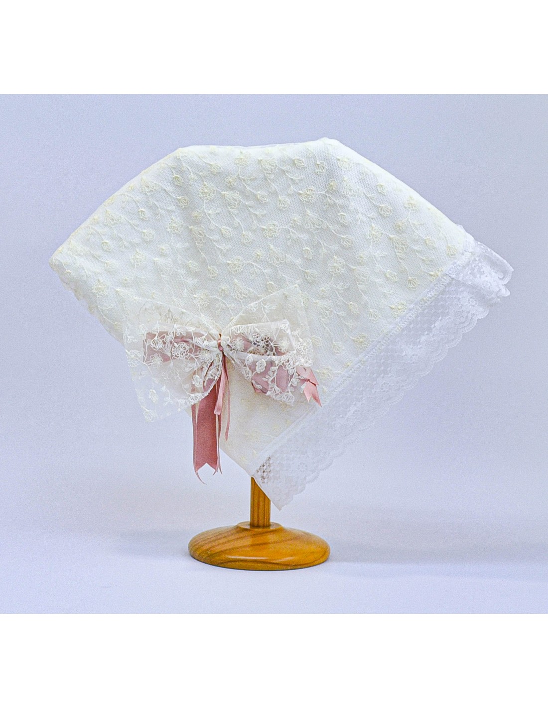 Toquilla en color blanco roto, con encajes de tul bordado del mismo tono y con lazada en colores: blanco, crudo, rosa bebé, rosa empolvado, celeste, verde agua, camel. Medidas aprox. 110×100 cm.