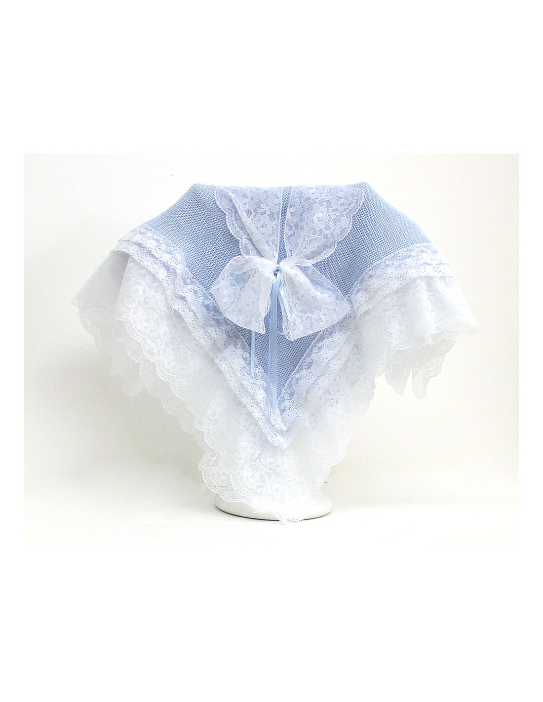 Toquilla de punto liso, tamaño 110×100 cm. aprox. en colores pastel y con encajes y roseta en blanco.