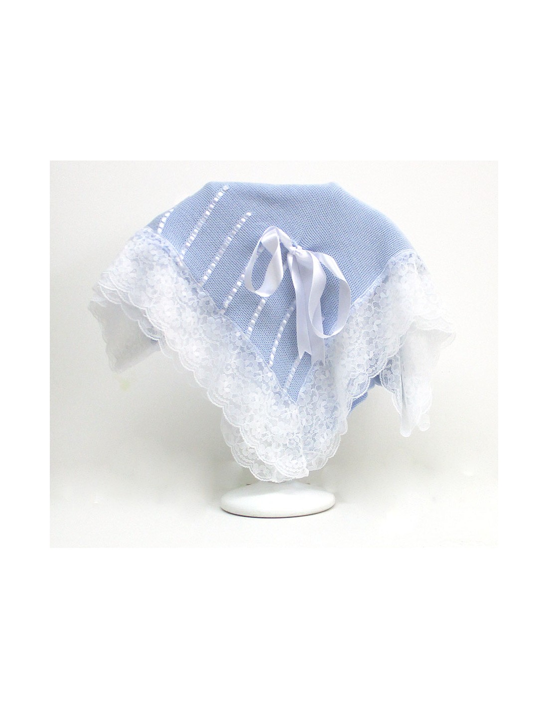 Toquilla de punto liso, tamaño 110×100 cm. aprox. en colores pastel y con encajes y lazos de pasamanería en blanco.