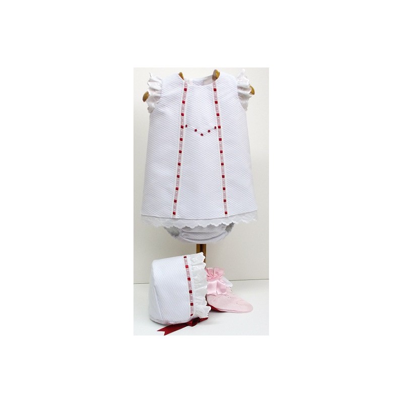 Vestido con braga, calcetin y capota, de tela en colores blanco o crudo y con terminaciones y lazos en un segundo color pastel.