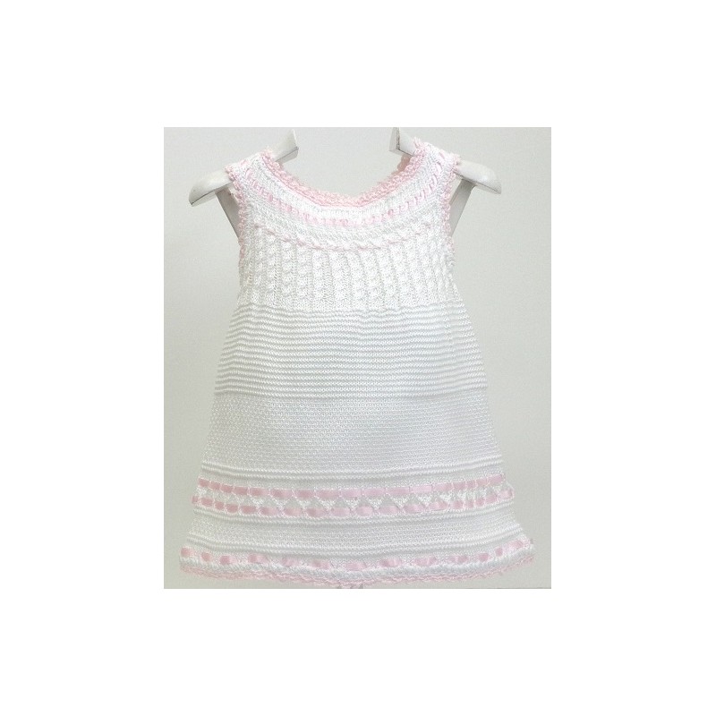 Vestido de punto en colores blanco o crudo, sin manga, con lazos y terminación a ganchillo artesanal en rosa o en celeste+ Braga a juego.