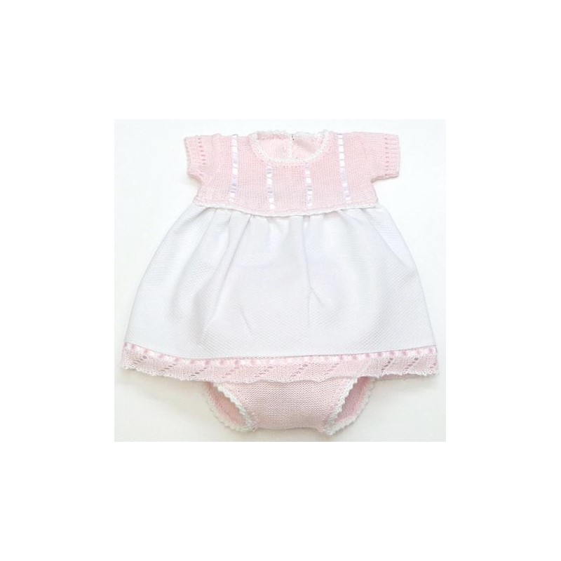 Vestido de cuerpo de punto con pechera de lazos entretejidos y la parte inferior de piqué y decoración de punto en el volante, manga corta, con braga del mismo tejido de punto, varios colores y tallas, la tela y encajes en crudo o blanco.