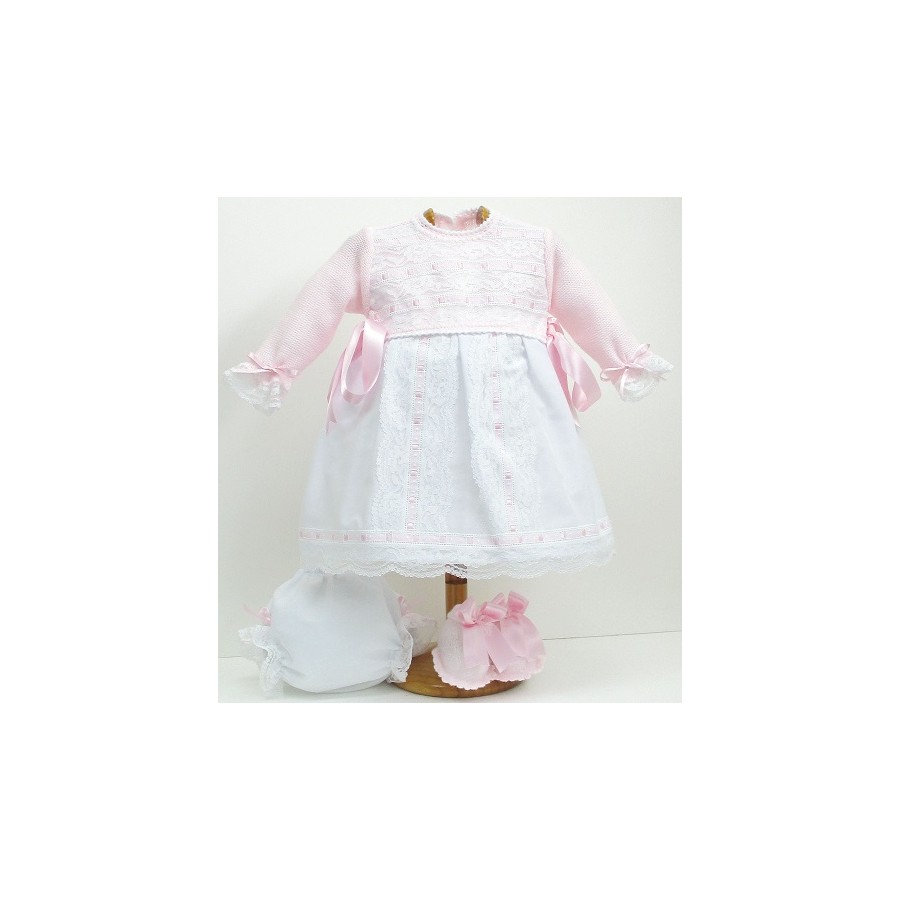 Vestido de manga larga, de cuerpo de punto en varios colores pastel y la parte inferior de batista organdizada en colores blanco o crudo y con encajes de guipure del mismo color. Braga y patucos a juego.