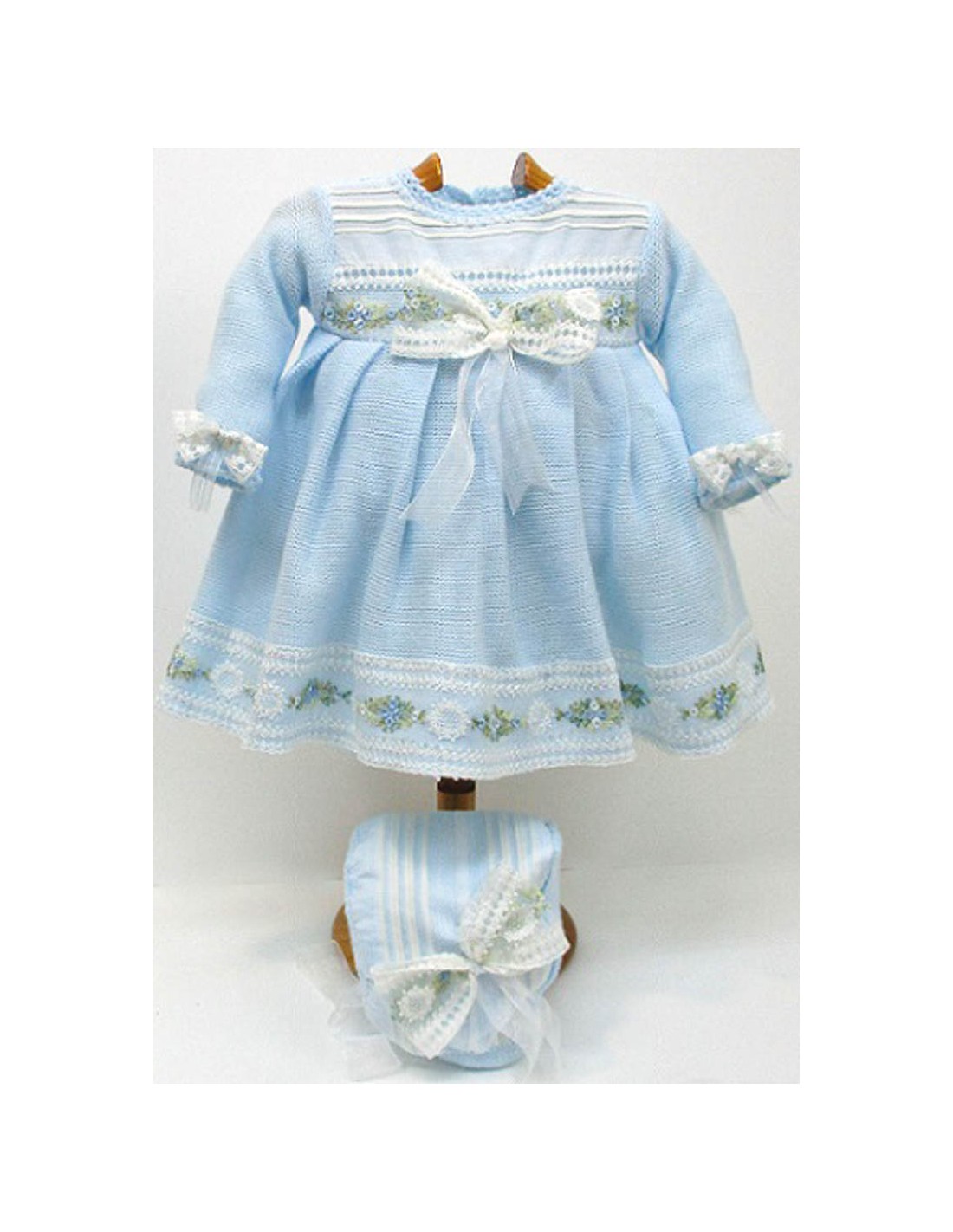 Vestido de punto y manga larga, el tejido de punto en crudo, rosa o celeste, con decoraciones de tul bordado. Capota a juego.