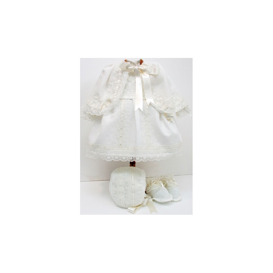 Vestido de manga larga, de cuerpo de punto en varios colores pastel y la parte inferior de batista organdizada en colores blanco o crudo y con encajes de guipure del mismo color. Capa, capota y patucos a juego.