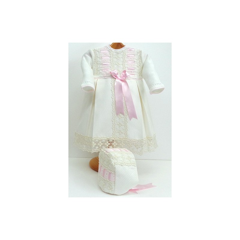 Vestido combinado, con encajes de guipure, la parte inferior de piqué y encajes en crudo, el tejido de punto y lazos en color al elegir. Capota a juego.