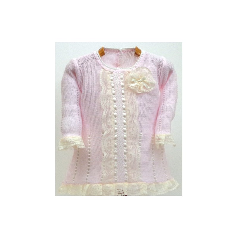 Vestido de punto en colores de bebé y tallas hasta 12 meses, los encajes y lazos en crudo o blanco.